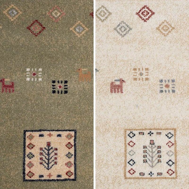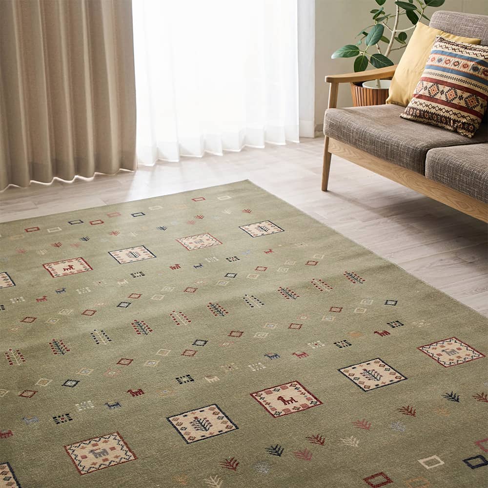 やさしい色合いのギャッベ柄の2色をご用意しました。明るい印象のアイボリーと、さわやかなグリーン。あなたのお部屋にぴったりなカラーをお選びください。