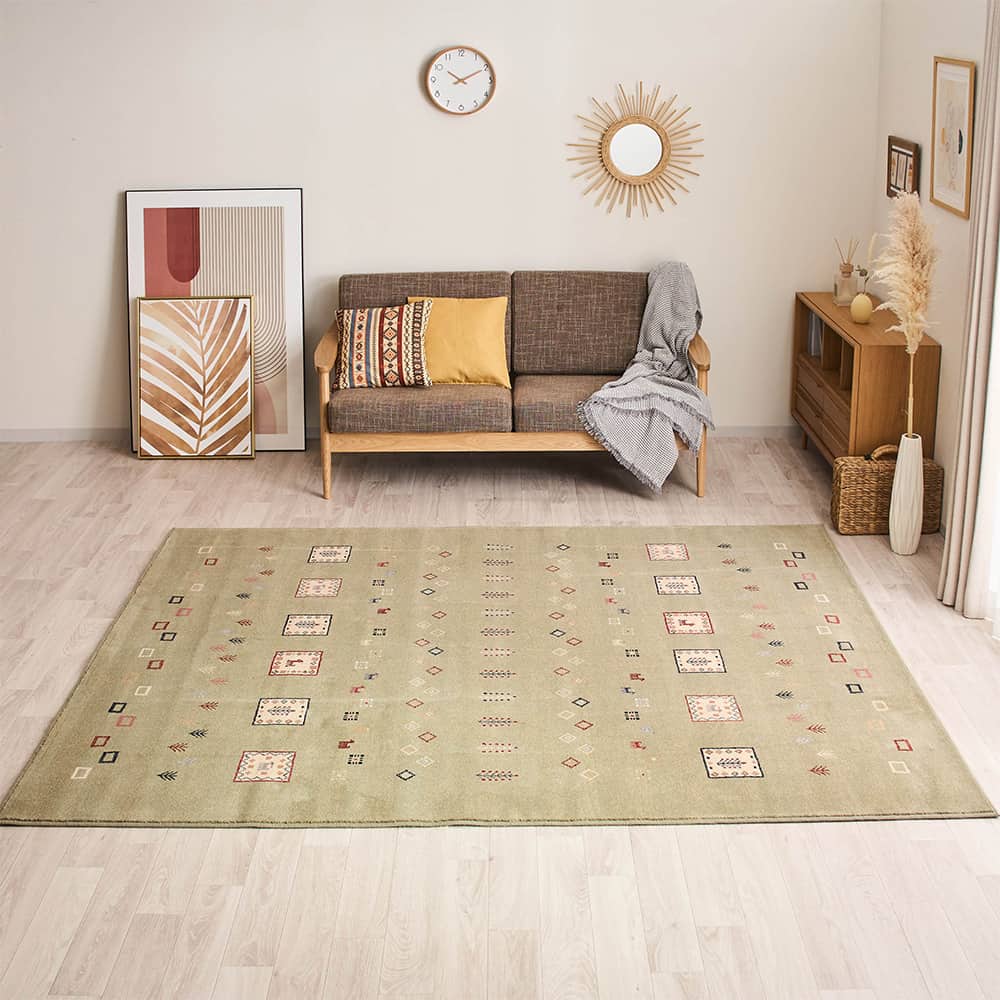 温かみのあるカラバリで耐久性も優れたウィルトン織りラグ。ギャッベ柄でデザイン性にも優れておりインテリアのメインとして映える1枚です。