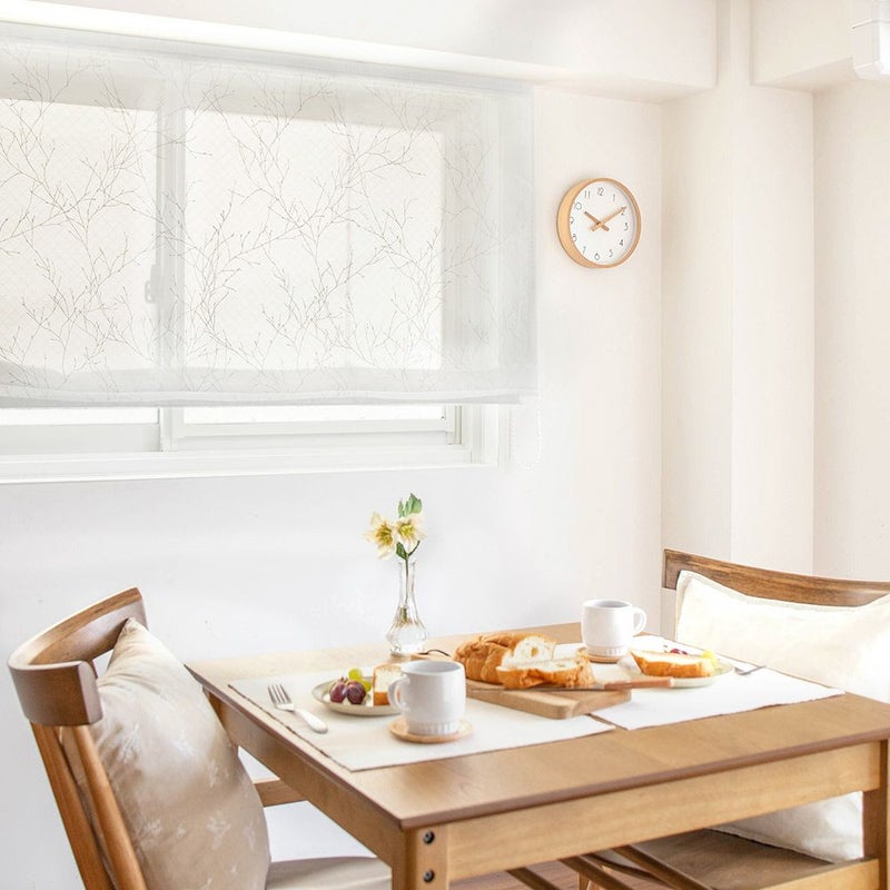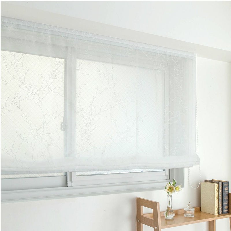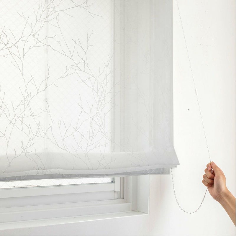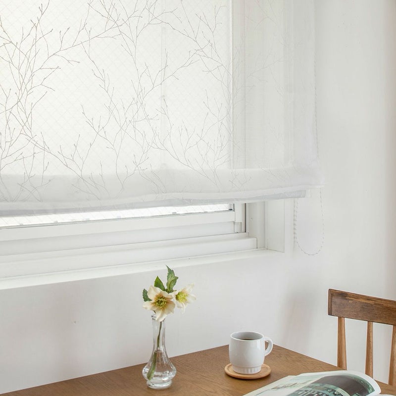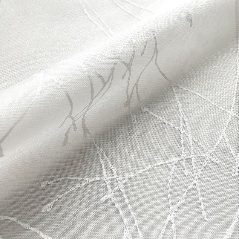 透明感のあるオーガンジーの生地に、繊細なペイントタッチの白い枝木柄を描いたレースシェードカーテン。北欧の幻想的な自然を感じる空気感が素敵。
