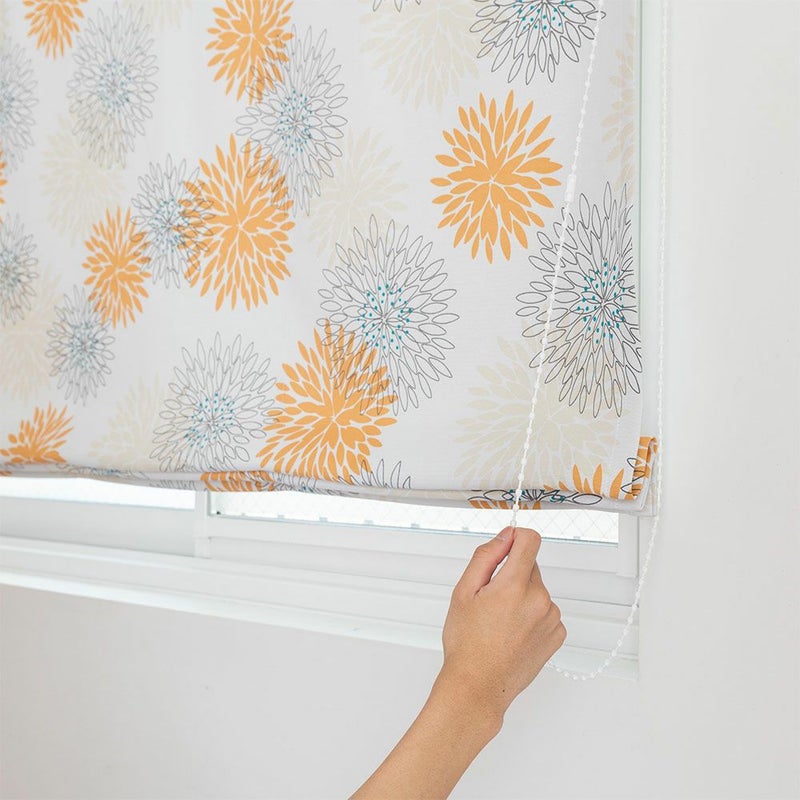 大きなドット柄や花火のようにも見える、菊の花をモチーフに使ったシェードカーテン。丸く広がる花びらがとても華やかで、北欧風インテリアに合わせやすいデザインです。