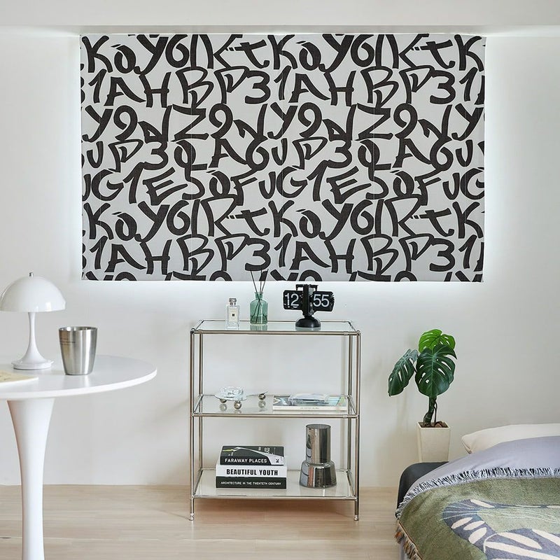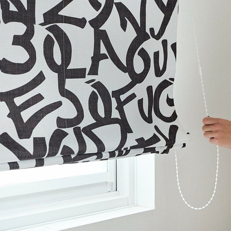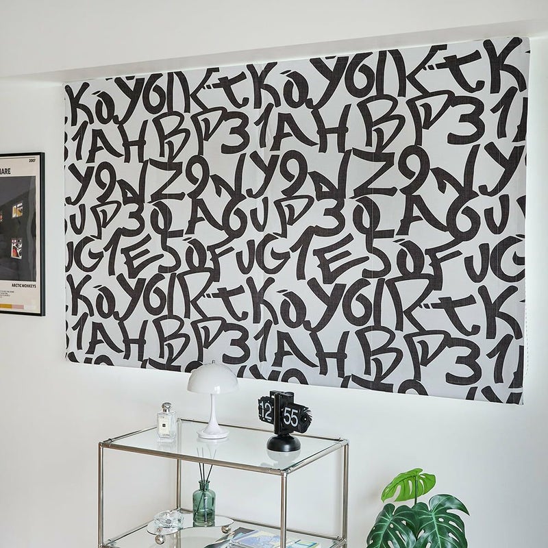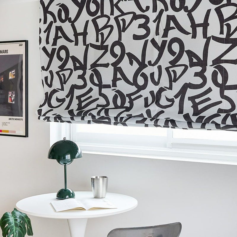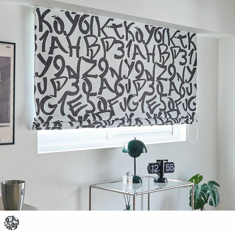 シンプルな手書き風の文字を、カーテン一面にダイナミックにデザインした遮光シェードカーテン。 シンプルながらも目新しさも感じさせる、ありそうでなかったデザインに仕上げました。つい自慢したくなるような、無機質なモノトーンカフェ風インテリアに早変わり。