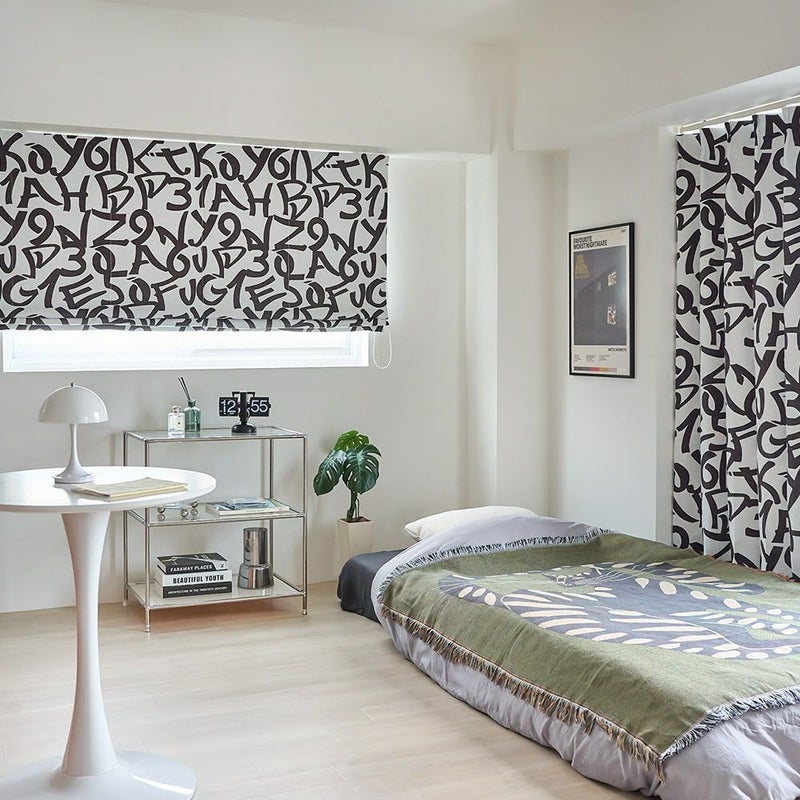 韓国でもトレンドな、無機質さが映えるモノトーンカフェ風インテリア。トレンドだからこそ、エッセンスとしてひと際目を惹くカーテンと同生地のシェードカーテンをコーディネートしてハイセンスさを表現。あなたが惹かれるものを詰め込んだ、同世代の憧れの的になるようなおしゃれ空間を作り上げよう。