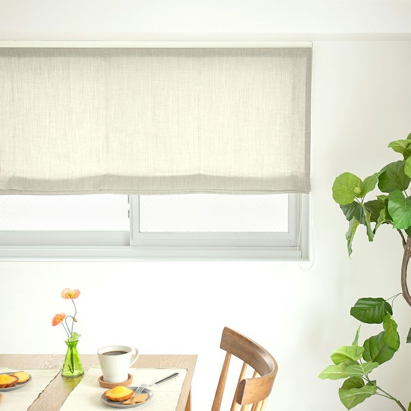 天然素材のような生地感とくすみカラーが魅力的な、ナチュラルな暮らしに似合うシェードカーテン。 天然素材のような質感なのに実際はポリエステル100%なのでお洗濯可能。さらに防炎機能付きなので、高層マンションでも安心してお使いいただけます。