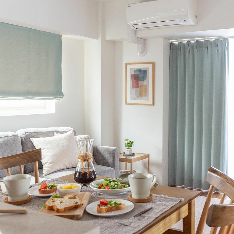 同生地のカーテンと合わせて窓辺をトータルコーディネートすることで、より北欧ナチュラルなインテリアに。主張の強すぎない淡くシンプルなカラーが使いやすく、馴染みやすいんです。