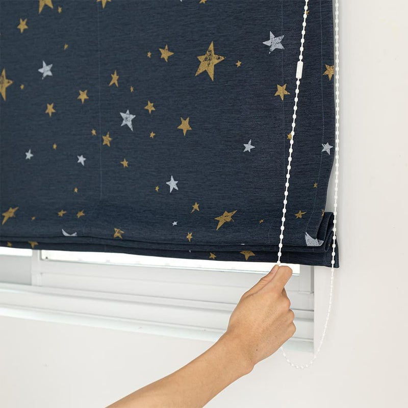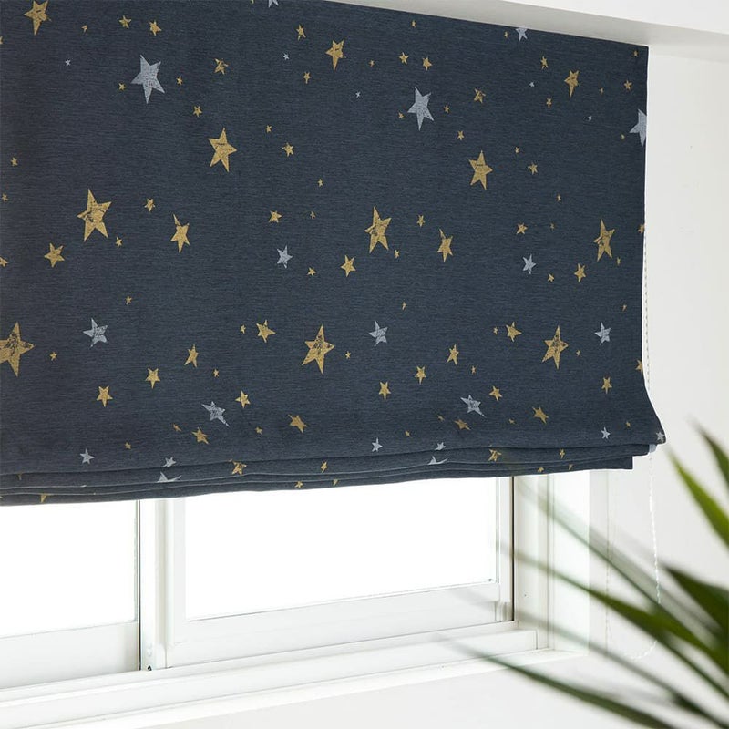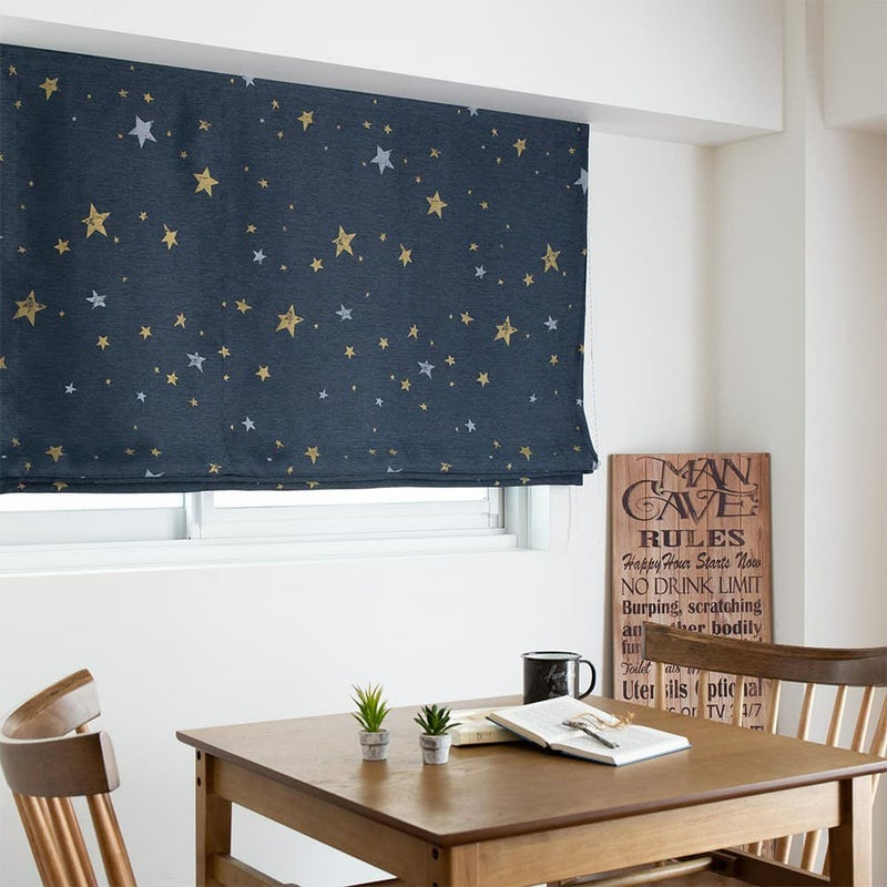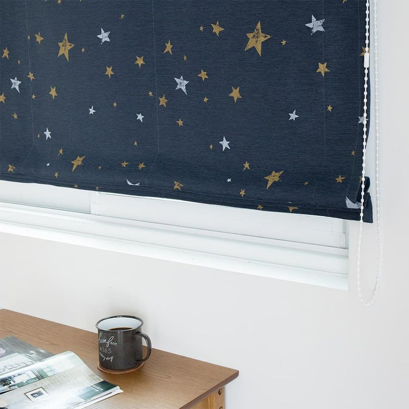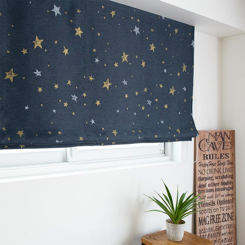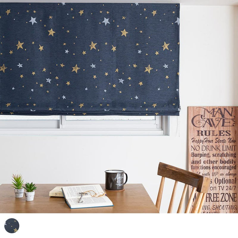 西海岸風インテリアにかかせないのが、マリン色のシェードカーテン。深みのある色合いの生地に、一つ一つ形の違う星柄をプリント。少しかすれ感を出したビンテージ風の表情もこのシェードカーテンのこだわりの一つ。アメリカの星条旗を連想させる星柄が西海岸風インテリアに GOOD!