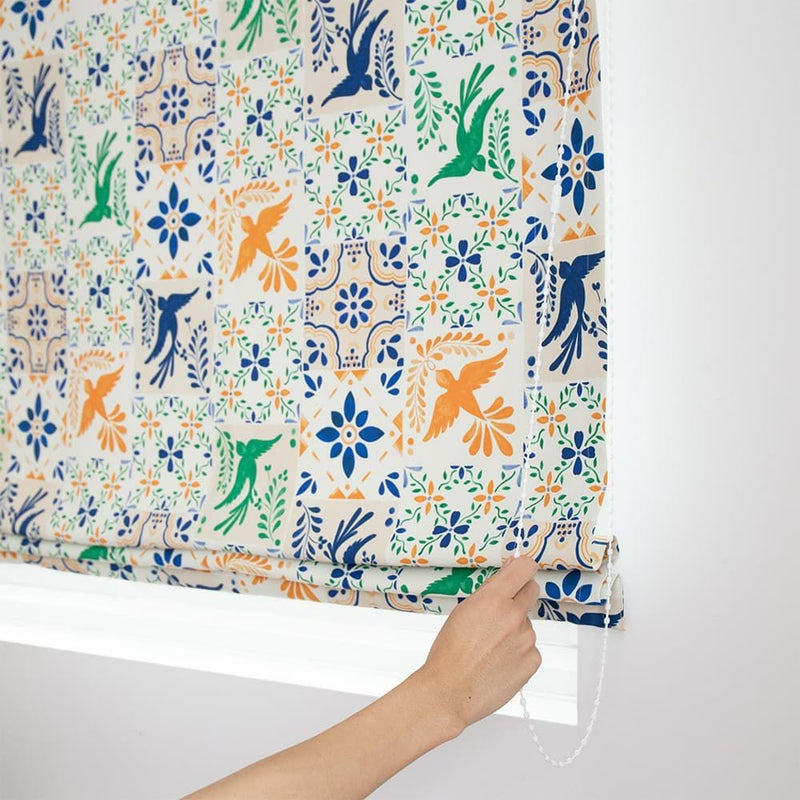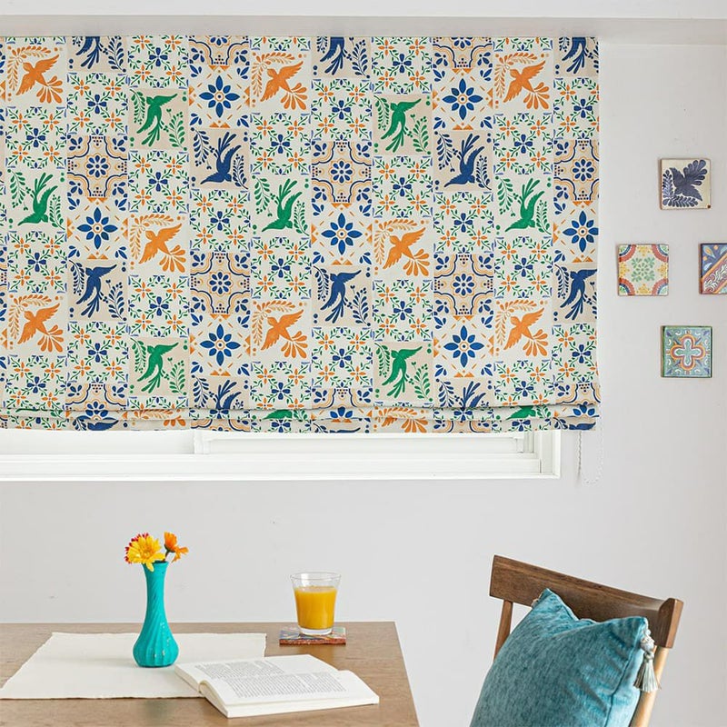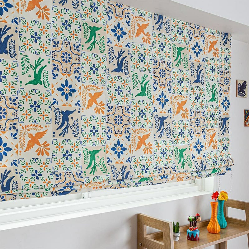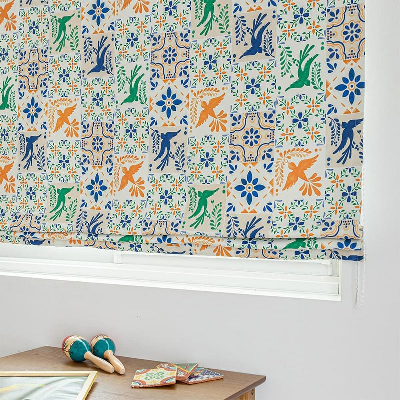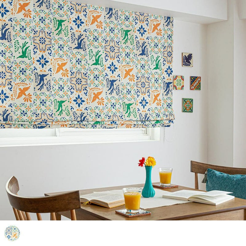 メキシコタイルでよく見かける鳥と花のモチーフ。鮮やかでおしゃれなそのデザインをシェードカーテンに落とし込んで。まるでタペストリーを飾ったような、華やかなアクセントの完成です。