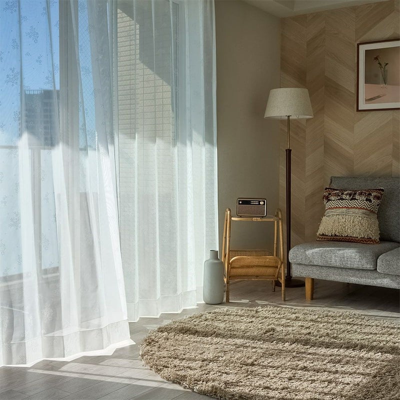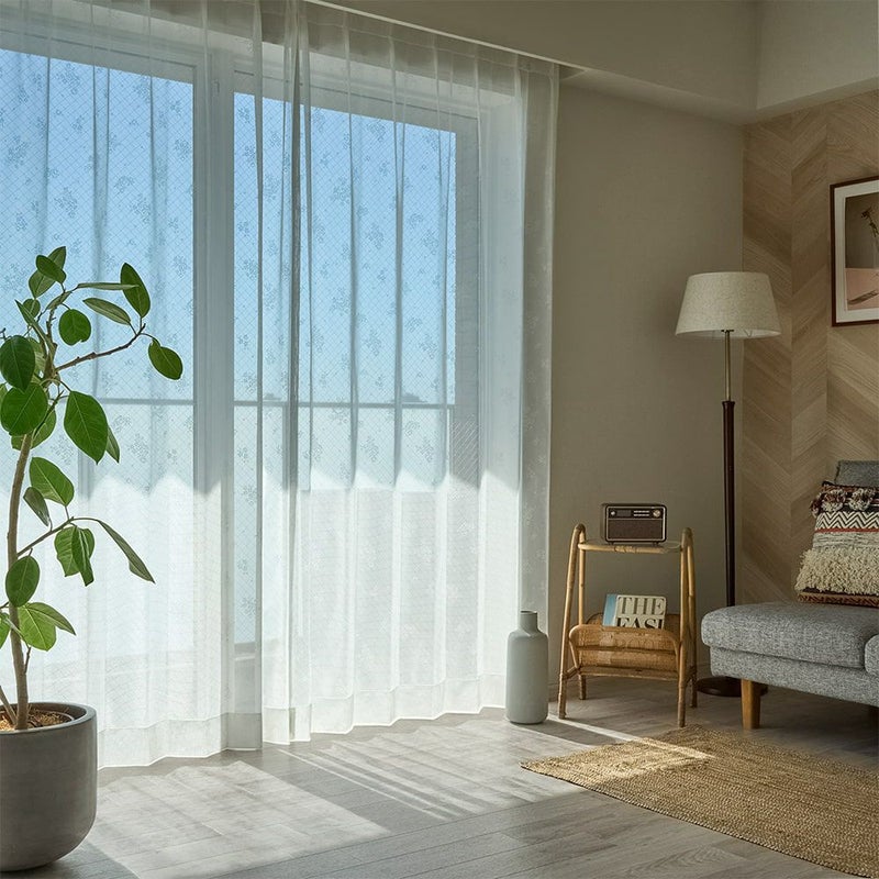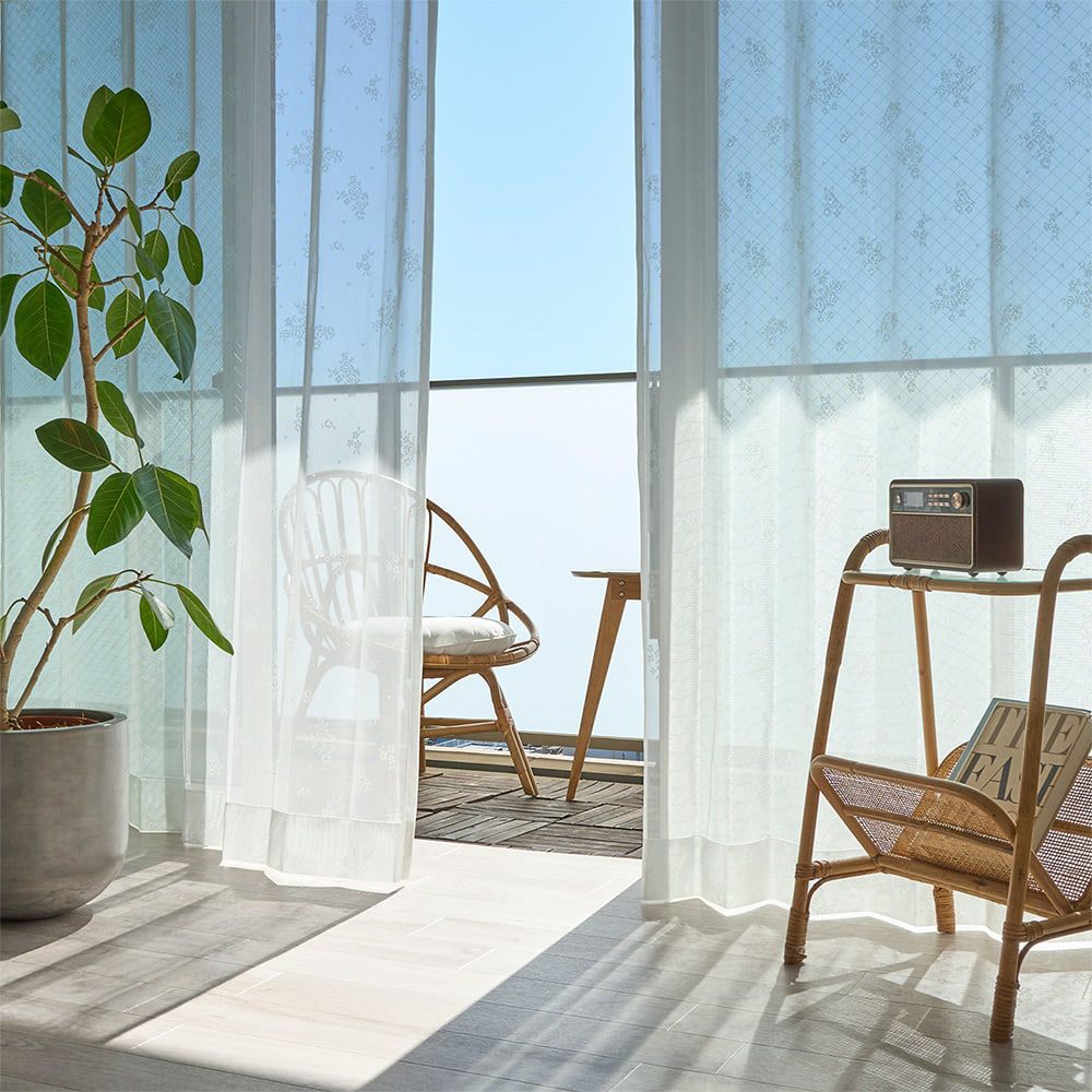 軽やかな透け感と、そこから差し込む優しい陽ざしを楽しむ。それはまさに、レースカーテンを選ぶ醍醐味でもあります。ほのかに透ける外の景色と、やわらかな陽だまりををお楽しみください。