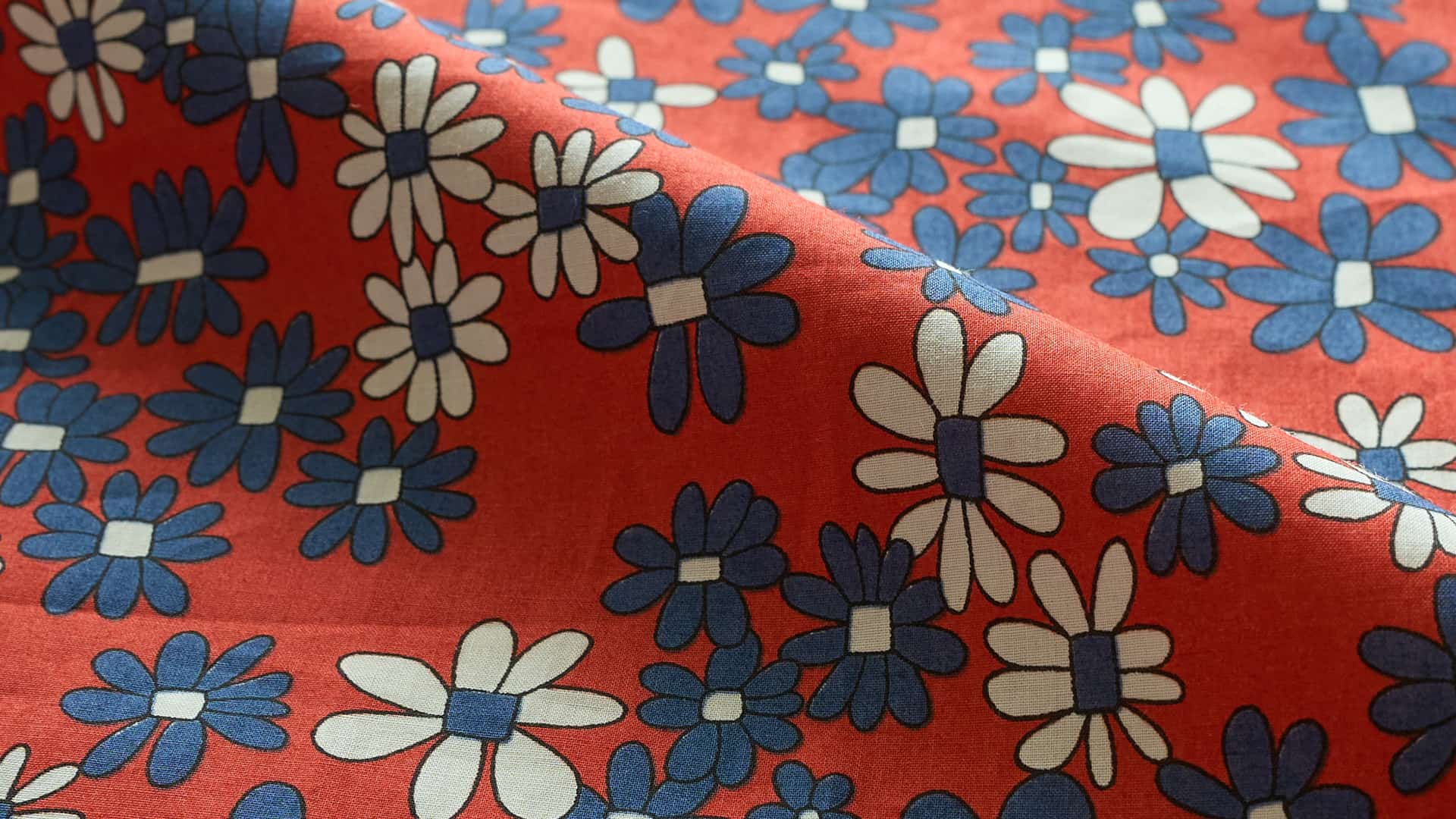 POPでチャーミングなカラーリングが魅力! ナチュラルでソフトなベージュは、カーキと白のフラワーで気軽に取り入れやすい。 ピーコックブルーはひねりのあるブルーで、明るいブラウンと白のフラワー柄が素敵。 ポップでとにかく楽しいレッドは、メリハリあるネイビーと白のフラワー柄です。