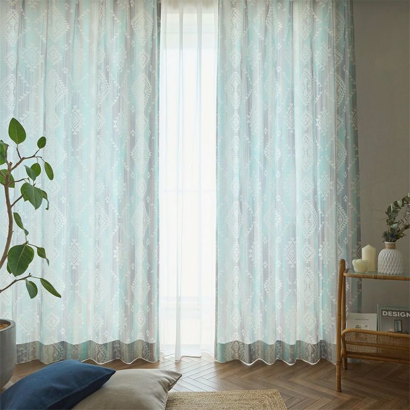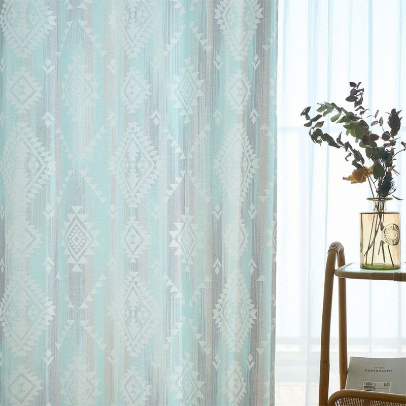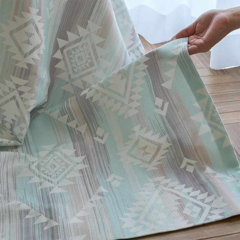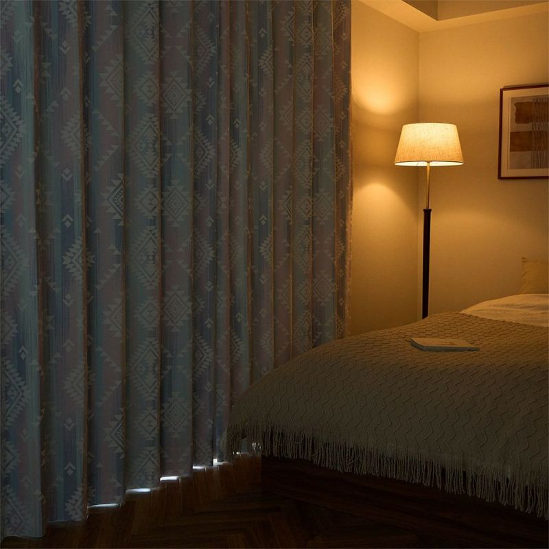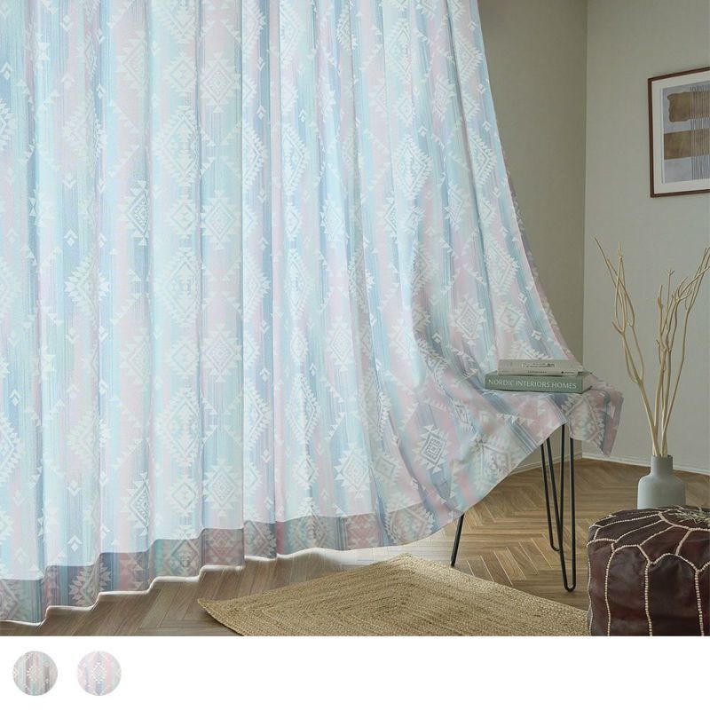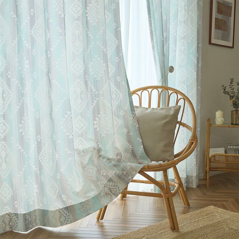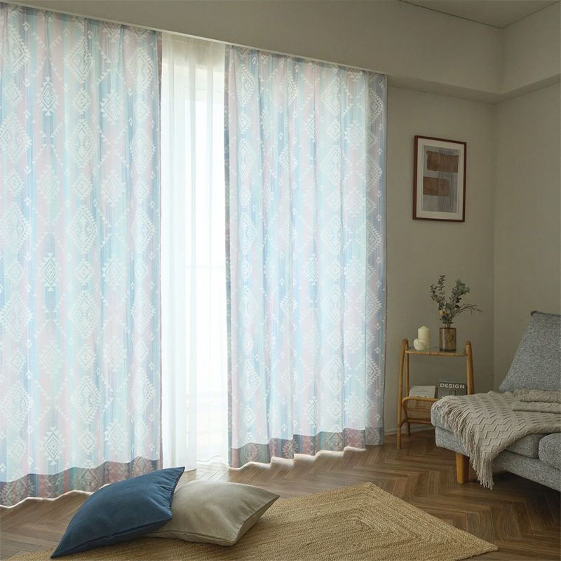 ふんわりとしたパステルカラーに、ほどよい存在感のネイティブ柄が印象的な非遮光カーテン。ラフさと可愛さが絶妙にマッチし、リラックスしながらも気分があがる空間にしてくれそう。