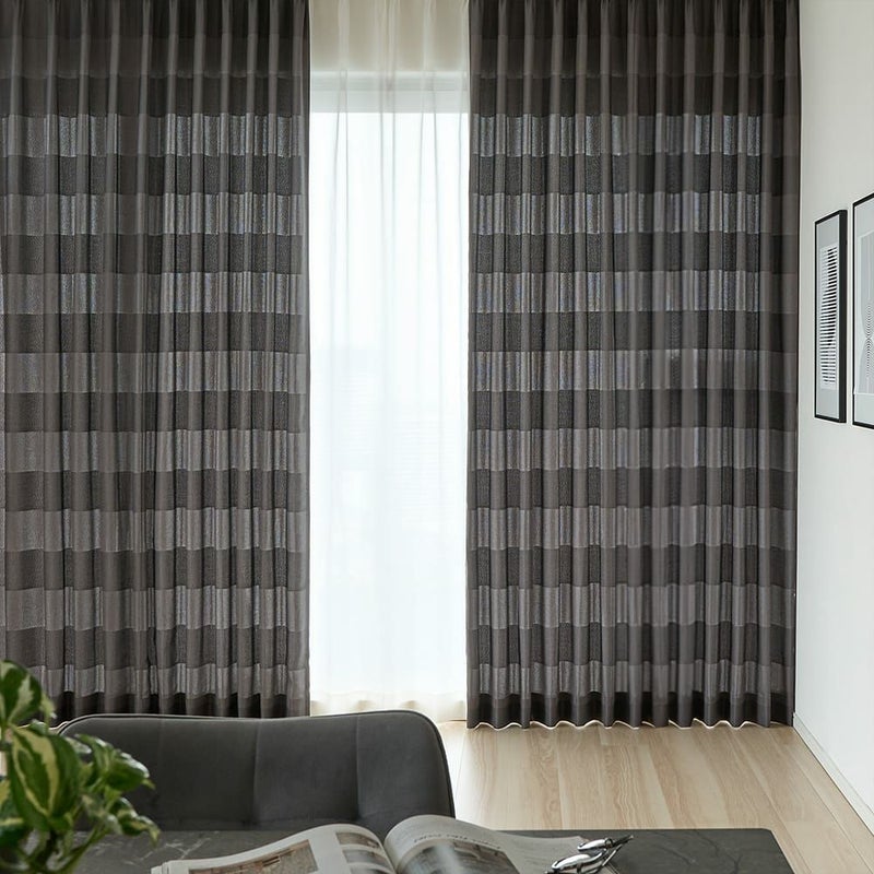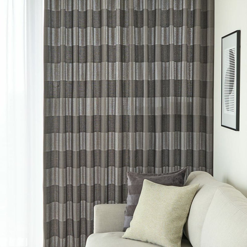 織り方の違いで表現された、広いボーダー柄がインパクトあるモダンカーテン。大胆なデザインと繊細な質感がバランスよく融合し、程よく抜け感ある空間に。モノトーンで直線的な印象が特徴であるモダンインテリアに、まさに相応しいカーテンだろう。