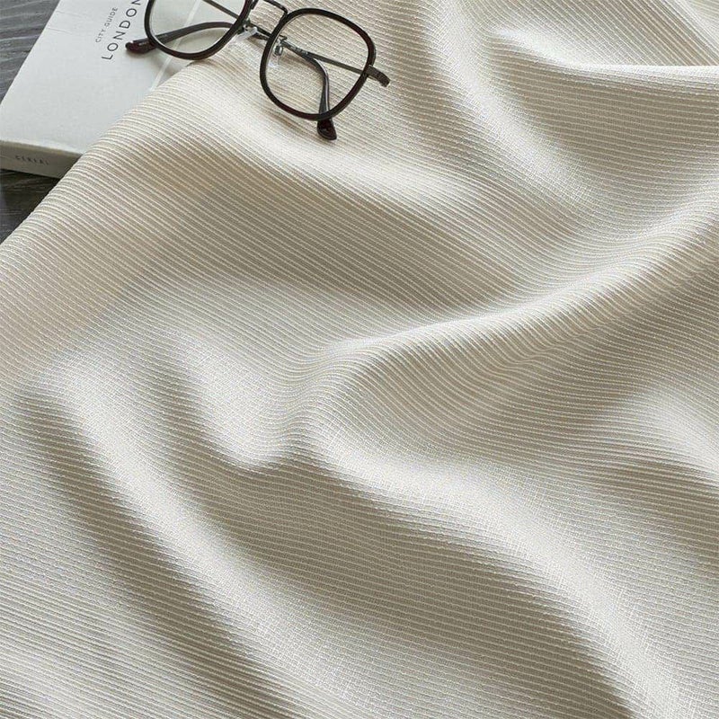 織り組織の違いでボーダーを表現した、巧みな技が光る生地感。細かい糸でざっくりと織られた質感は、軽やかで是非とも夏に取り入れたい爽やかさ。軽快な印象に対して、モダンなカーテンらしい光沢感も持ち合わせ、クオリティーの高さを物語っている。