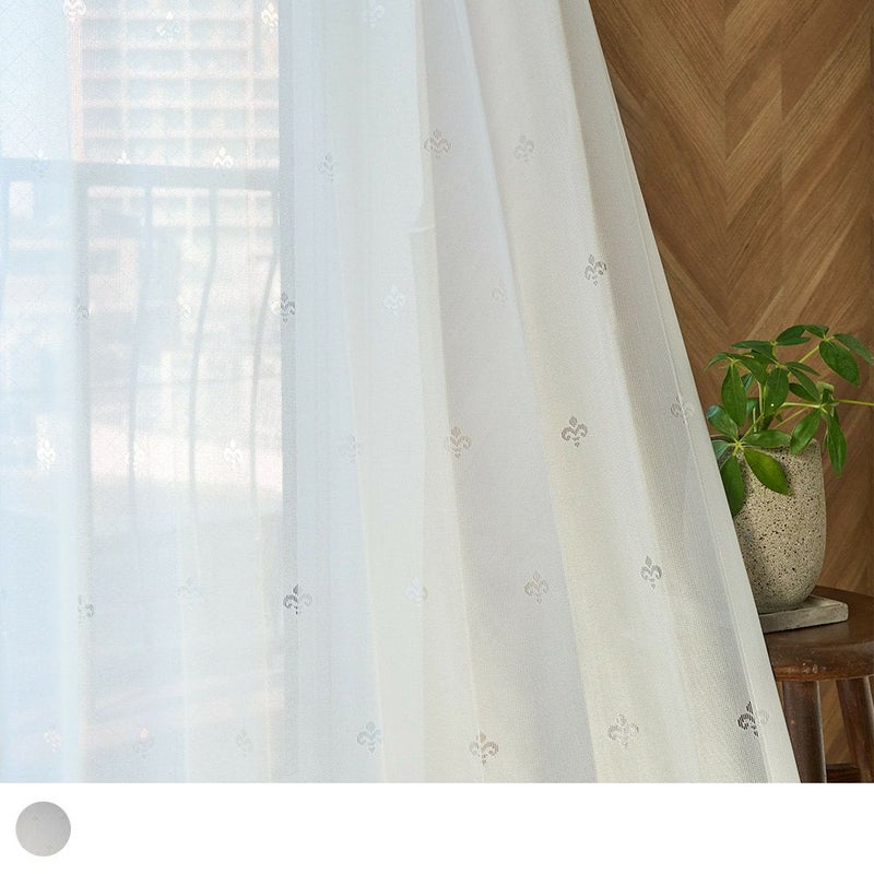 無地レースだから紋章柄が映える、シンプル&シックなデザイン。 ドレープカーテンとのコーディネートも楽しんで。