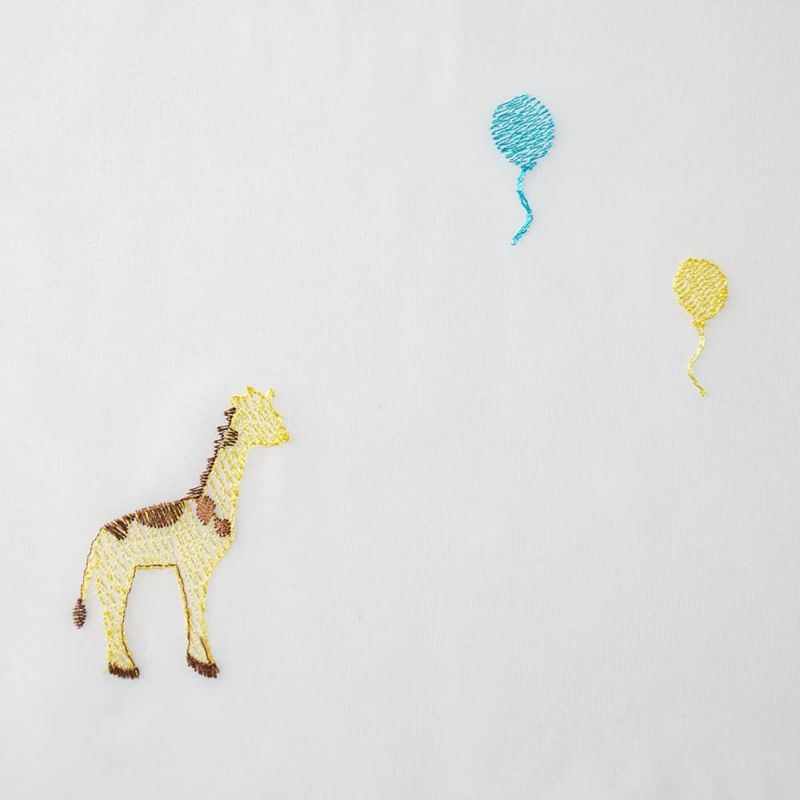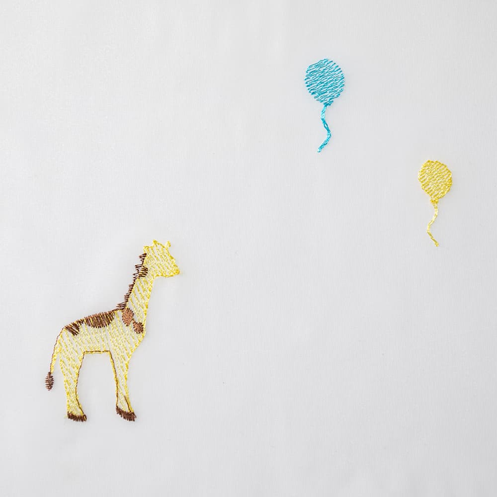 外の景色を感じる、程よい透け感のレースカーテンです。陽に当たると、キリンさんと風船が空で遊んでいるみたい♪レースカーテンならではの、軽やかな透明感を感じていただけます。