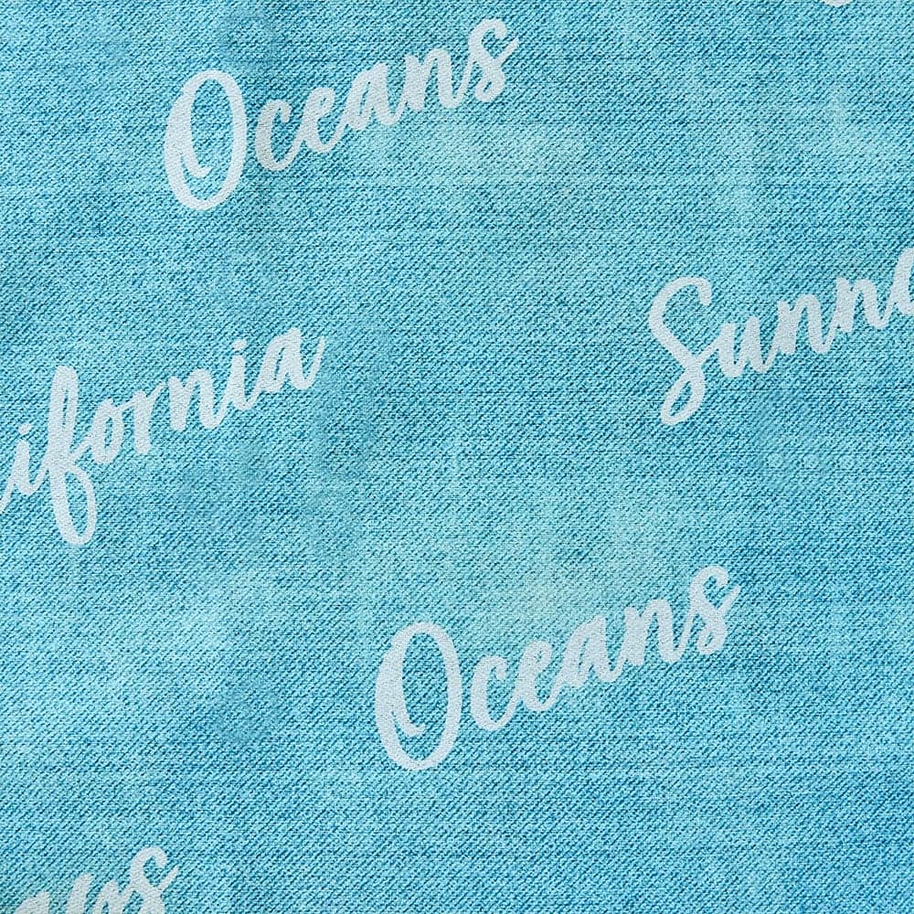 爽やかなカラーとグランジ感が映えるデニム調のカーテン。サーフメッセージ風に晴れた日(Sunny Day)と海(Oceans)などを描いた、当店のオリジナルカーテンです。メッセージ性のあるおしゃれなカーテンで、あなただけのこなれた西海岸インテリアを完成させよう。