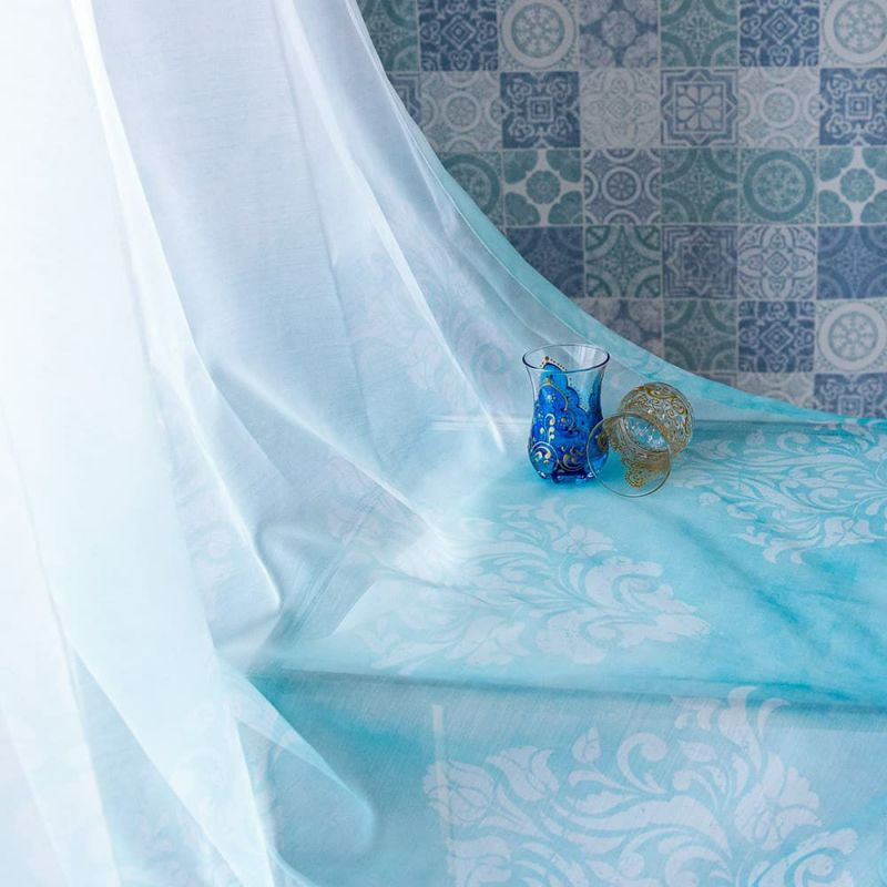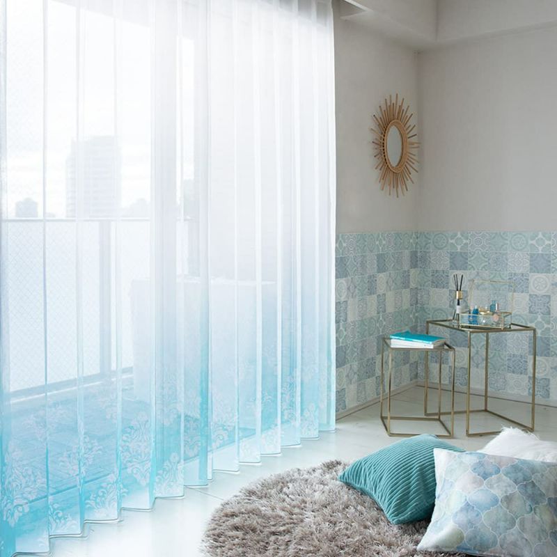 アラベスク模様を水彩風タッチのグラデーションで落とし込んだ、息をのむ程美しい、当店だけのオリジナルレース。下絵羽と呼ばれる、裾だけにデザインを施したこだわりのレースで、お気に入りのインテリアをご満喫いただけますように・・・。