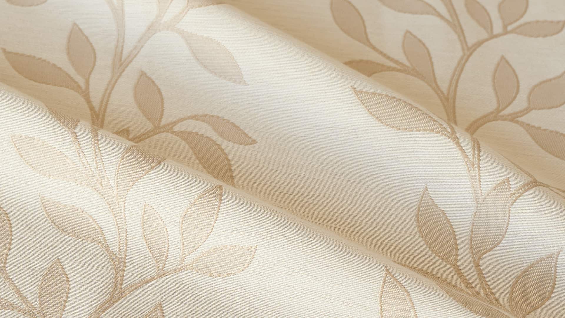 上品ながらどこかナチュラルさもある生地感に、爽やかな若葉のシルエットパターンが、窓辺を美しく引き立たせてくれます。どんなインテリア、どんなお部屋にも馴染むベージュカラーだから、寝室にもリビングにもおすすめです。