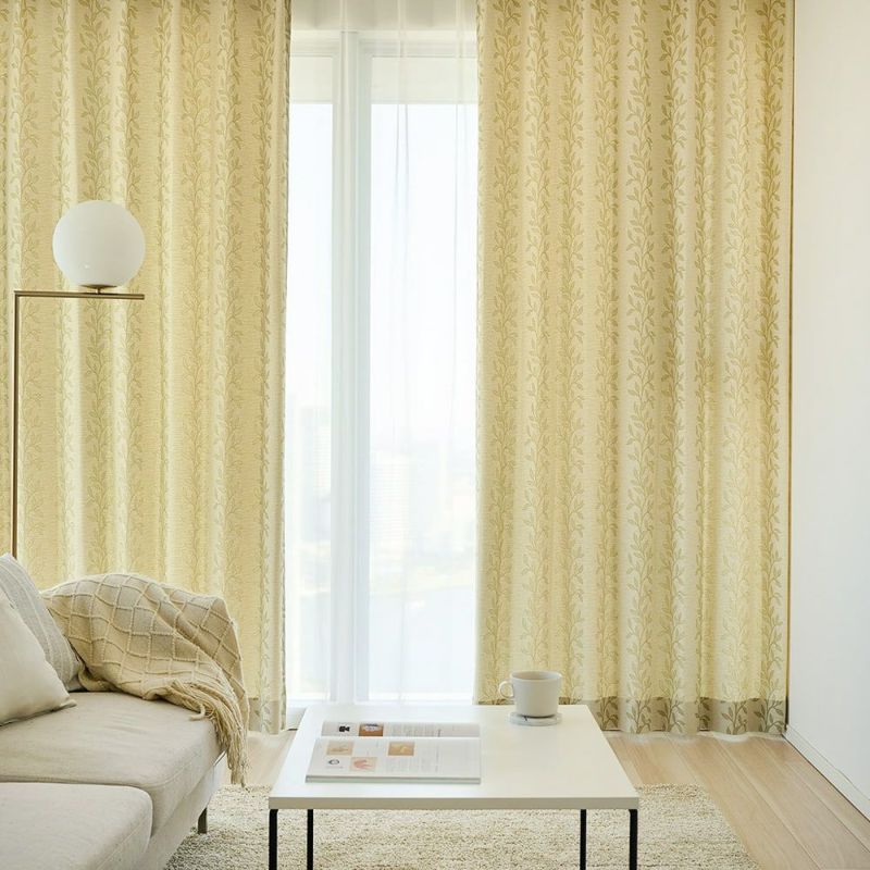 上品ながらどこかナチュラルさもある生地感に、爽やかな若葉のシルエットパターンが、窓辺を美しく引き立たせてくれます。どんなインテリア、どんなお部屋にも馴染むベージュカラーだから、寝室にもリビングにもおすすめです。