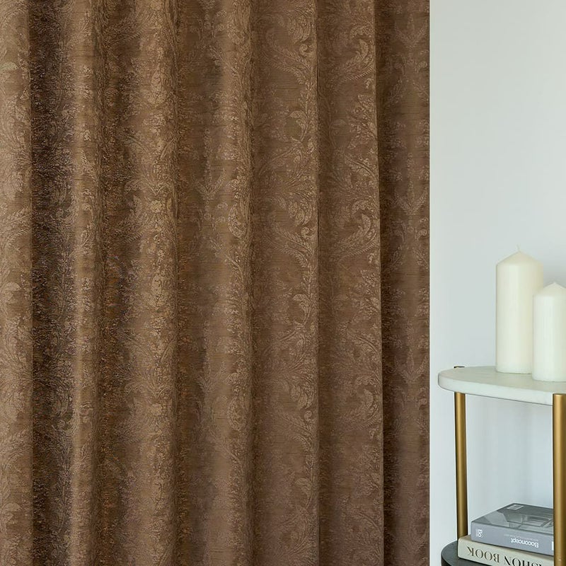 国内大手カーテンメーカーの上質なジャガードカーテンが、アウトレット限定の特別価格で登場! 重厚感のある上品なブラウンカラーに、繊細なダマスク模様を施した、美しい3級遮光カーテン。ジャガードならではの、奥行きのある華やかな表情を見せてくれるカーテンです。