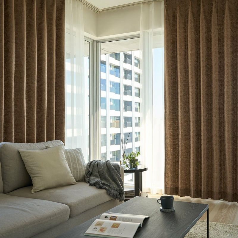 昼間の日の明かりを、ほどよく受け入れる3級遮光カーテン。心地よい光を取り入れ、ゆとりのある空間に。光の加減で表情を変えるダマスク柄が、空間をより洗練された雰囲気に彩ります。