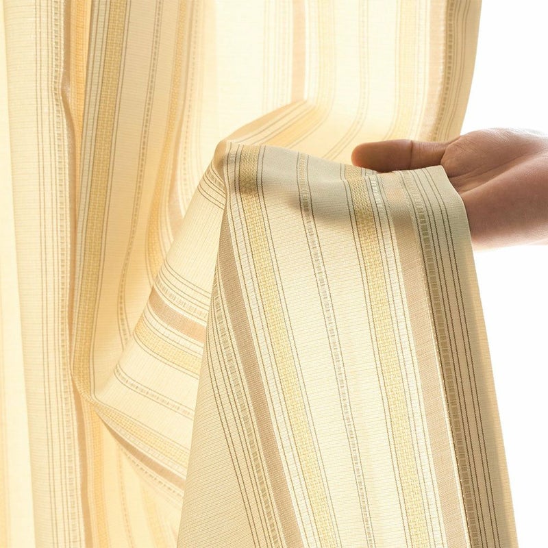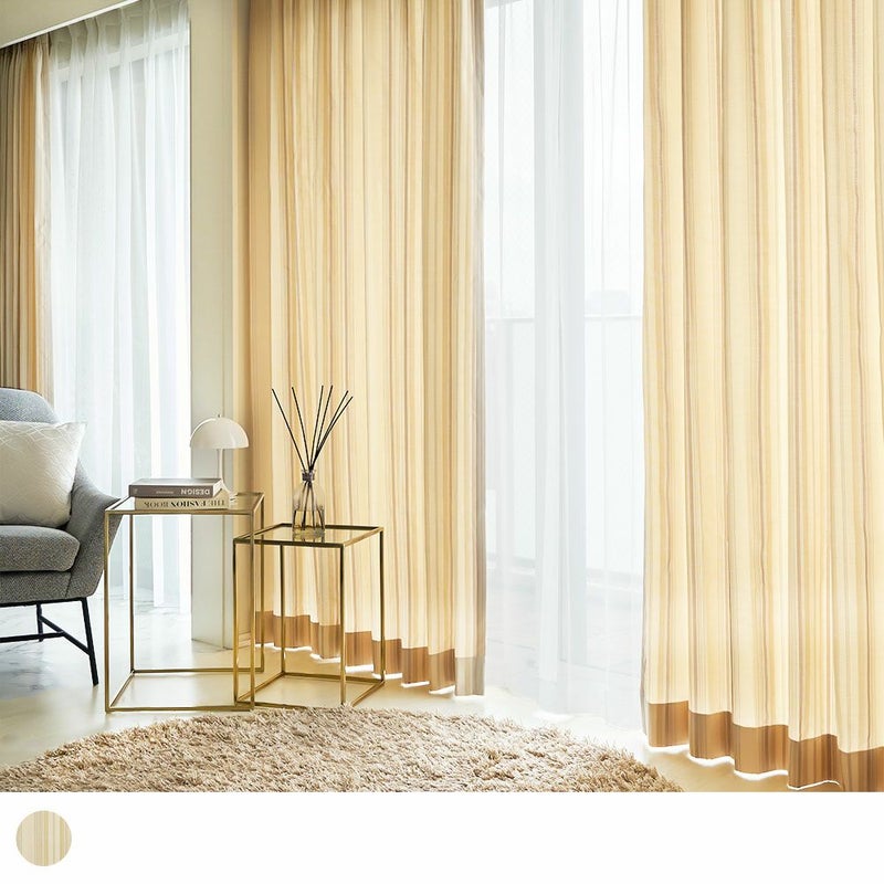 ハリ感と程よい硬さのある生地は、高級感と重厚感を演出します。部分的にデザインされたストライプは、光沢のある糸で織り込まれており、角度によって表情を変える奥行きのある輝きを放ちます。クラシカルな空間はもちろん、モダンな空間にも取り入れることで、洗練された大人の雰囲気を演出することができます。