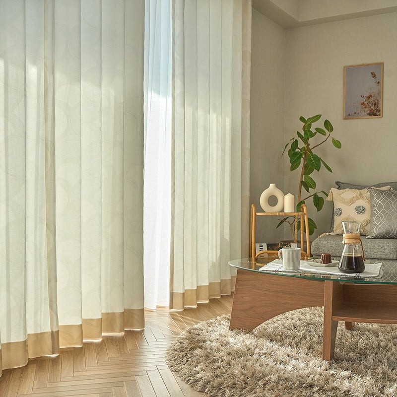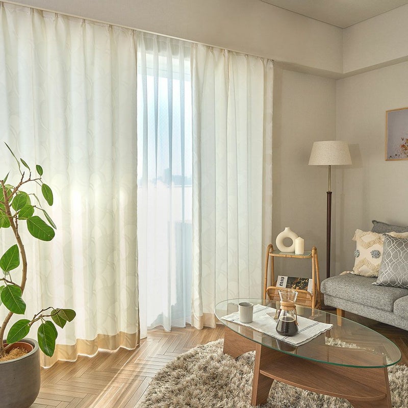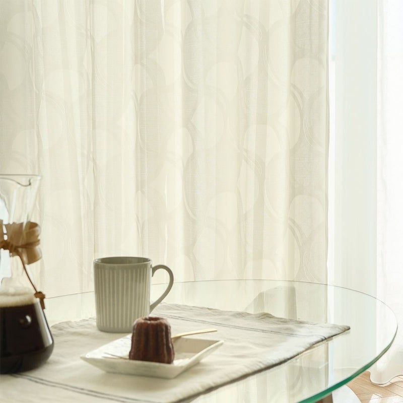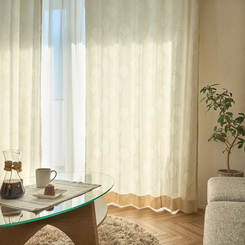 非遮光のカーテンの魅力は、何といっても時間帯や季節によって異なる光の表情を楽しむことができること。さりげない幾何学模様が陽の光とミックスされることで、お部屋にさりげない個性をプラス。織りで表現されたデザインは、上品で落ち着きのある印象を与えます。