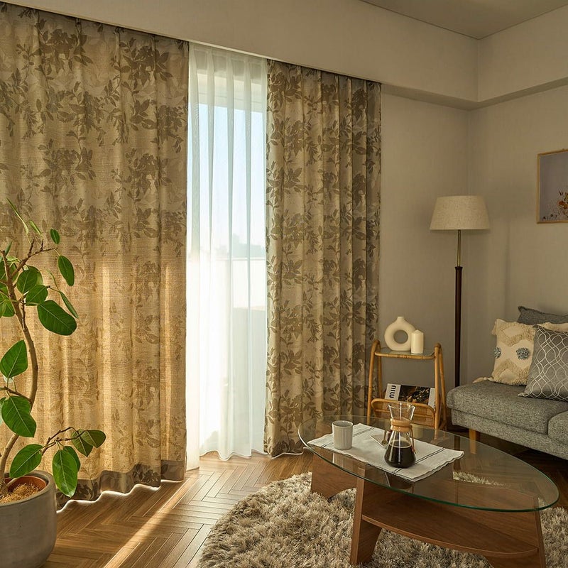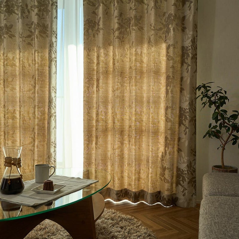 リーフ柄のジャガードカーテンが、お部屋に緑豊かな空間を演出します。非遮光なので、朝日が心地よくお部屋を照らし、すがすがしい一日をスタートできます。上質なアウトレット品で、あなたの暮らしに彩りを。