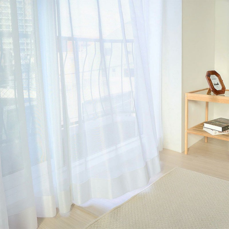 陽が差し込む窓辺で、ふわりと揺れるボーダー柄のレースカーテン。 お手頃なアウトレット価格だけど、デザインも機能も妥協したくない、そんなあなたにお届けする、特別なレースカーテンです。