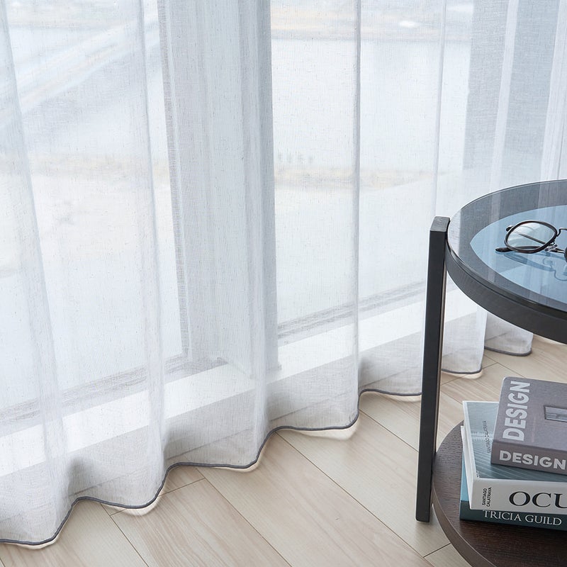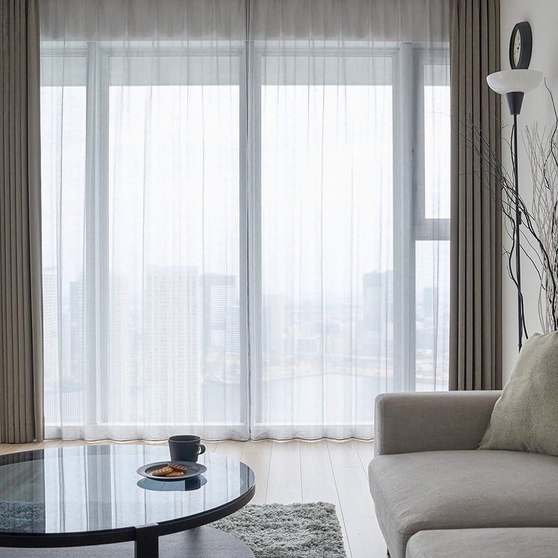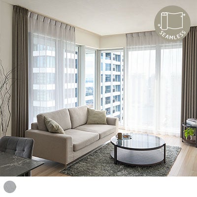 淡いグレーが目を落ち着かせ光をやわらかく透過。ほどよく外を感じられる開放感で、落ち着きと広がりを両立した窓辺に。