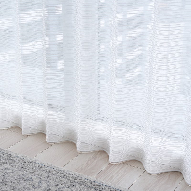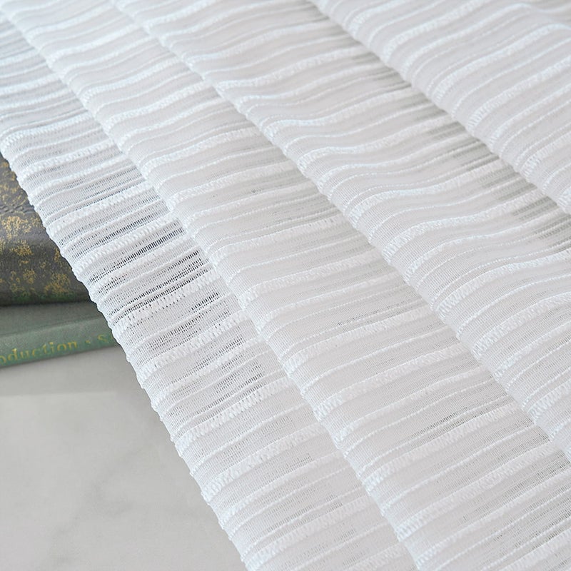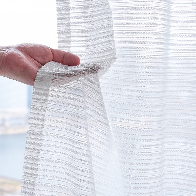 巾継ぎのないシームレス仕立てで、窓辺に美しい一体感。織りボーダーが光をやさしく通し、空間に上品なエレガンスを添えます。 -