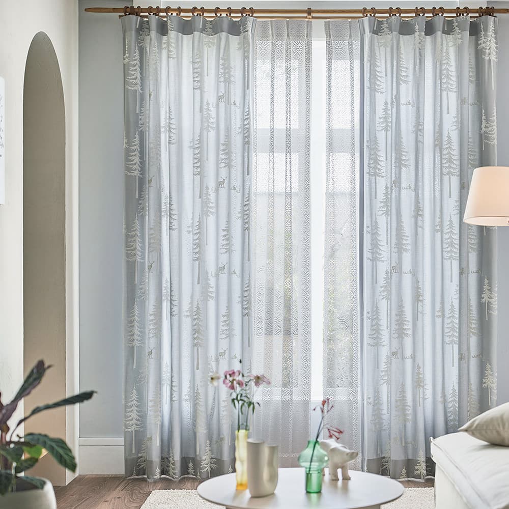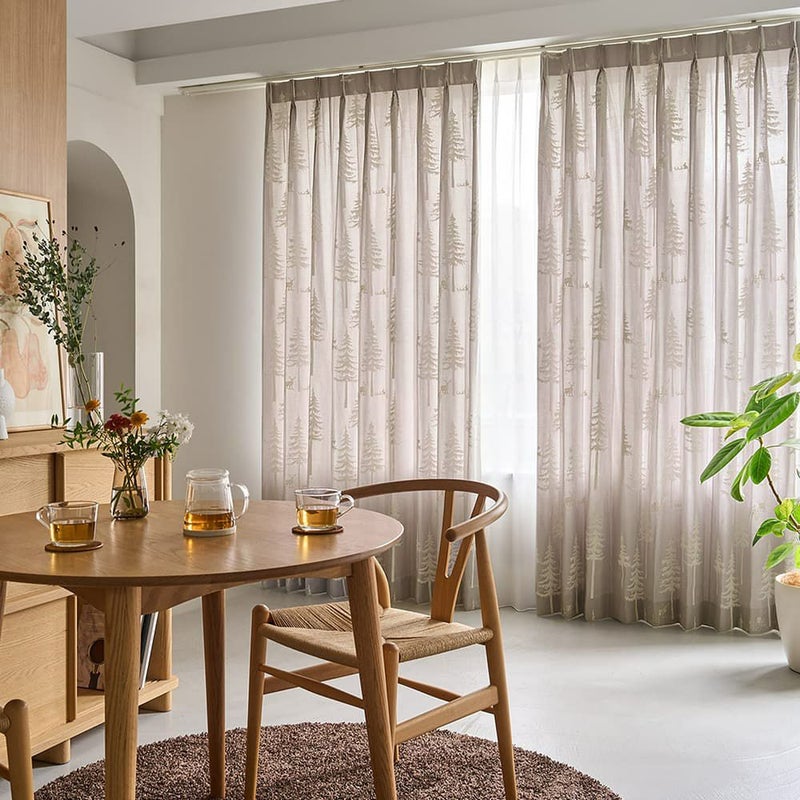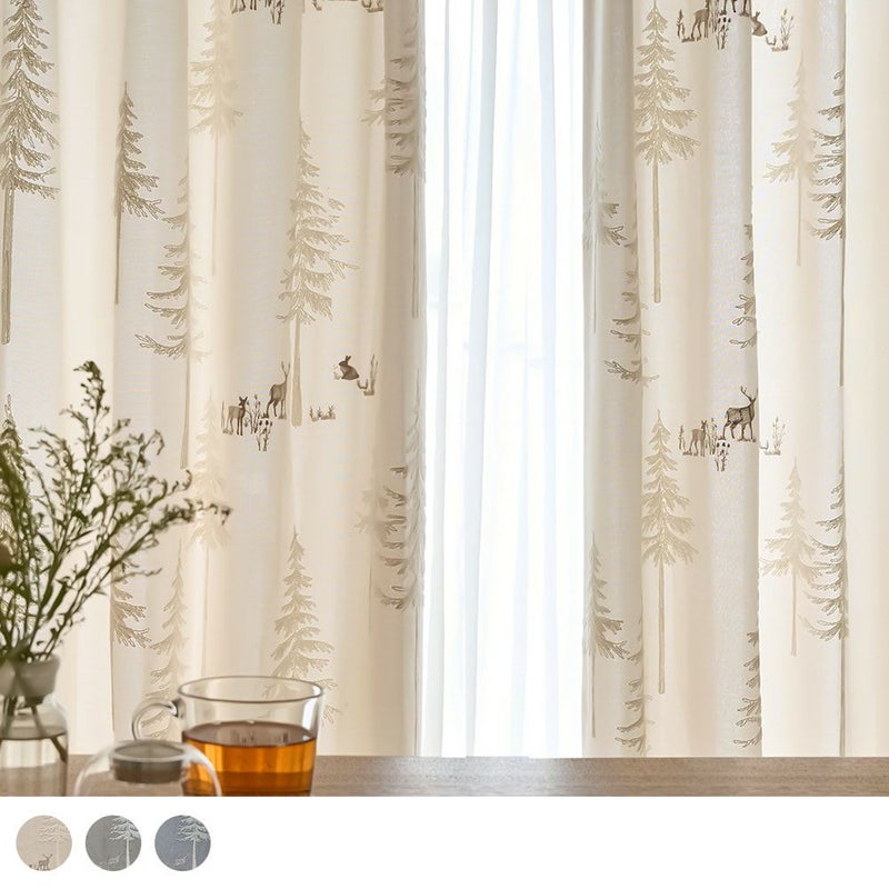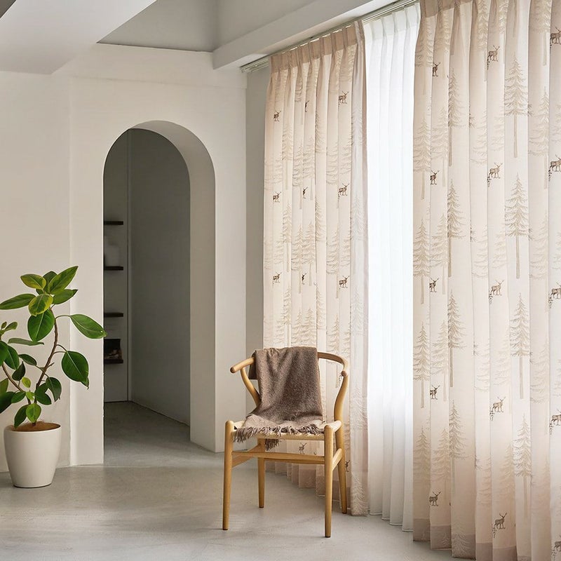 モール糸で刺繍された木々が美しい「ルボワ」は、ナチュラルスタイルにぴったりの柔らかな佇まい。木々の周りに集う動物たちのシルエットも愛らしく、心からほっこりとさせてくれるカーテンです。 -