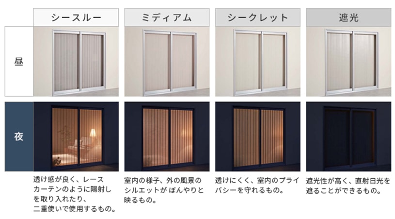 人通りがたくさんある側の窓の場合は遮光をおすすめしますが、そうでない方はシークレット、ミディアムなどでも十分なのではないでしょうか。