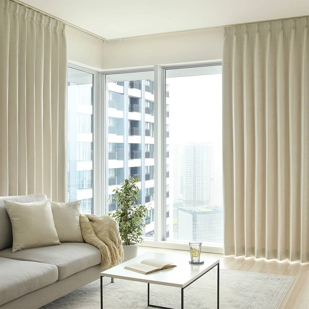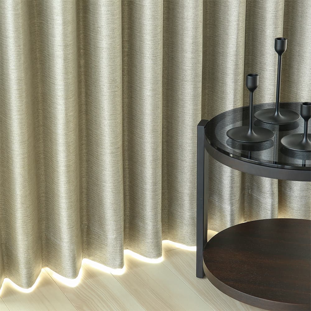 こちらのカーテンの魅力はなんといってもまばゆいほどの艶感と、繊細な織りが生む豊かな表情。静かに主張する上質なカーテンが、窓辺からホテルライクな空間を叶えます。