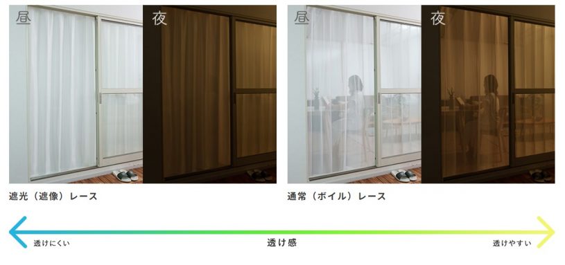 遮光カーテンで目隠しをしたいのに、なぜレースカーテン…?と思う方もいらっしゃるかもしれませんが、遮像レースカーテンとは、昼も夜も透けないレースカーテンの事です。レースカーテンと侮る事なかれ、その実力は十分にあります。