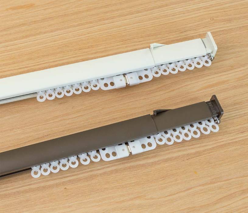 カーテンレールの両端にある金具を回す、またはレバーを引くことで、カーテンレールを縮めることができます。