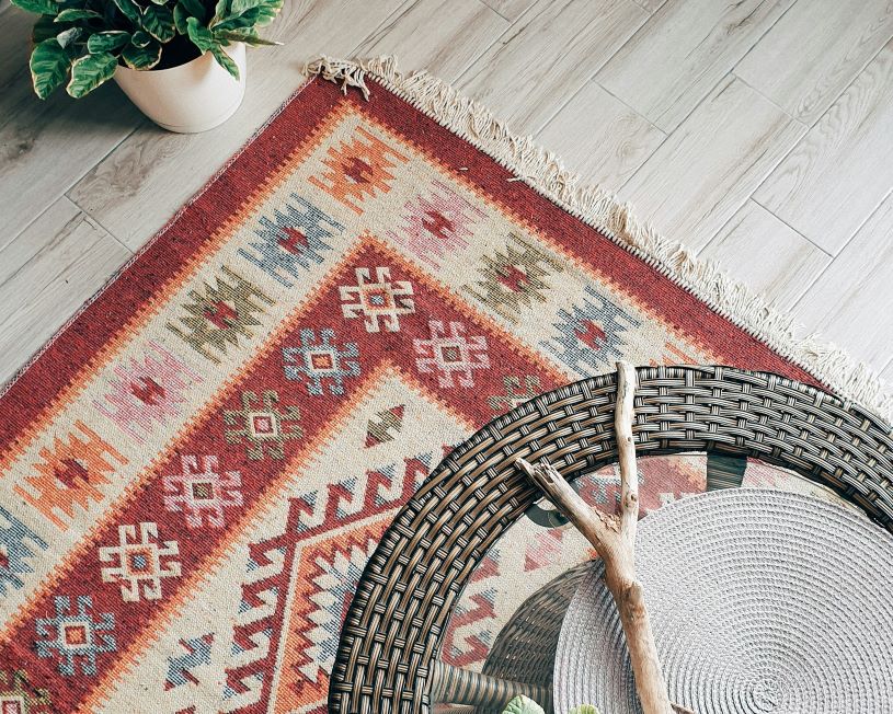 手織りならではの温もりを感じられるキリム柄ラグ。