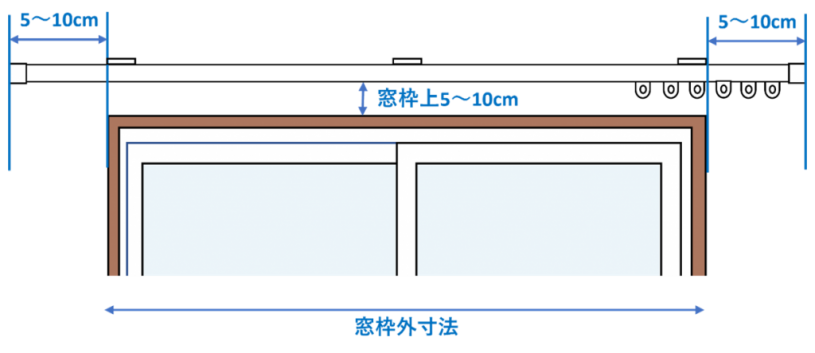 下地があり、なおかつ窓枠から5~10cmほど上の場所に取り付けます。レールの両端も、窓枠から5~10㎝はみ出るイメージです。