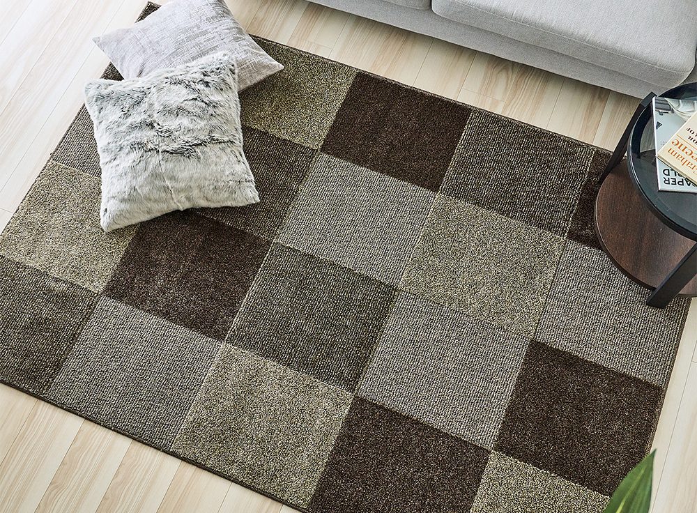 低彩度で落ち着いたトーンの2色展開が魅力のブロックデザインラグ。大きなブロック柄とシックな色合いが、洗練されたおしゃれな雰囲気を演出します。