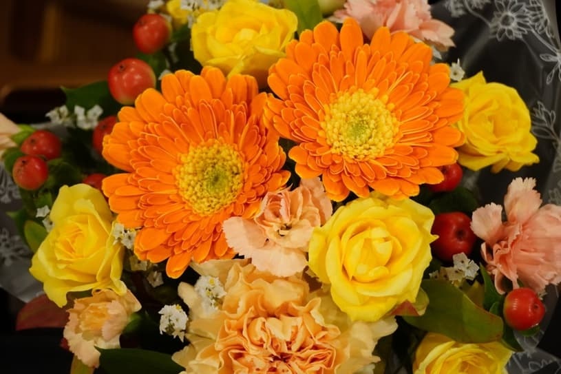 ガーベラやミモザなどを取り入れると、華やかで明るい雰囲気に仕上がります。さらに、ベリーや小さな実があしらわれたデザインを選ぶと、フレッシュでナチュラルな印象が加わり、より季節感のあるギフトになります。