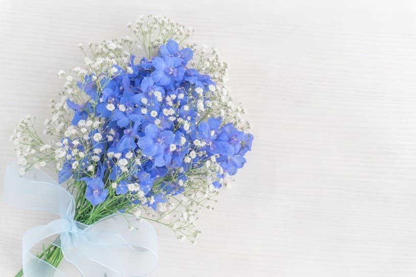 デルフィニウムやラベンダーなど、すっきりとしたラインや細身の花を選ぶと、より洗練された雰囲気に仕上がります。余白を感じるような軽やかなアレンジもおすすめです。