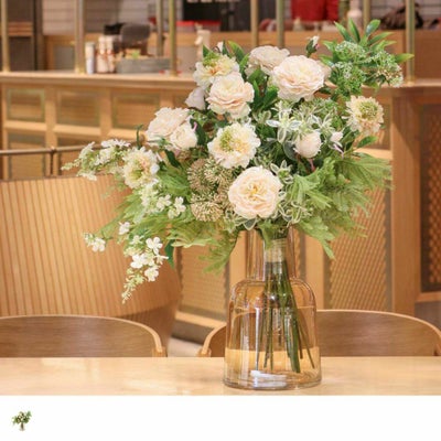レビューを書く - 造花 陽だまり色のアーティフィシャルフラワーブーケを、琥珀色のベースに束ねて<琥珀のブーケ> | パーフェクトスペースカーテン館