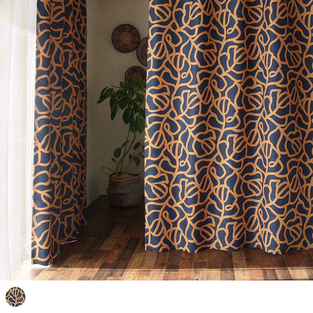 【最短・翌日出荷】アフリカン 遮光カーテン ユニークでパワフル!POPアートのようなグラフィカルデザイン <オレンジリーフ ネイビー> レビュー | パーフェクトスペースカーテン館