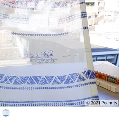 カヌーを漕ぐスヌーピーたちが描かれたレースカーテン <ローウィング ブルー> レビュー | パーフェクトスペースカーテン館